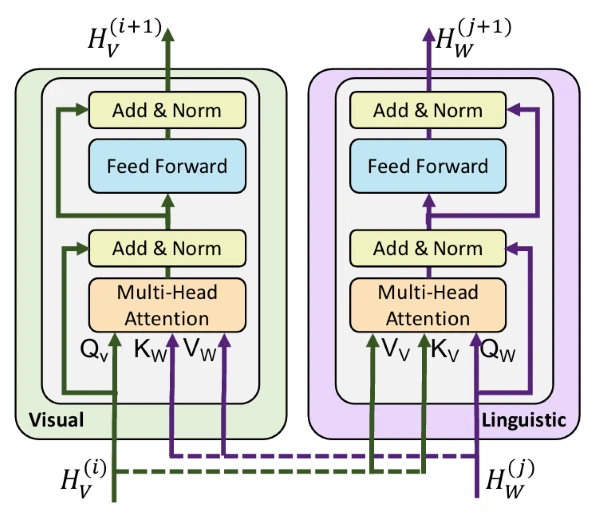 co-attention에서는 자신의 모달리티를 Query로, 다른 모달리티를 Key-Value로 사용해요. 예를 들어 Visual block은 강아지 이미지를 Query로 사용하고, Key와 Value로 “A pile of sleeping puppies”라는 문장을 사용해요. 이렇게 이미지 query와 문장 key의 관계를 파악해 서로 어떤 정보가 연결되어 있는지 학습해요. 마지막으로 value로 들어온 문장 “A pile of sleeping puppies”의 각 토큰이 이미지의 어떤 부분과 얼마나 관련 있는지 매핑해요.