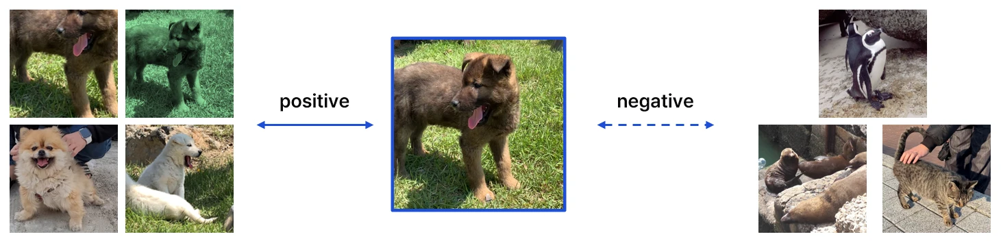 Contrastive Learning은 positive pair는 가깝게, negative pair는 멀리 위치하도록 데이터를 정렬하는 기법이에요. 다시 말해, 연관 있는 데이터는 유사도를 높게, 반대는 유사도를 낮게 계산하도록 데이터를 학습해요.