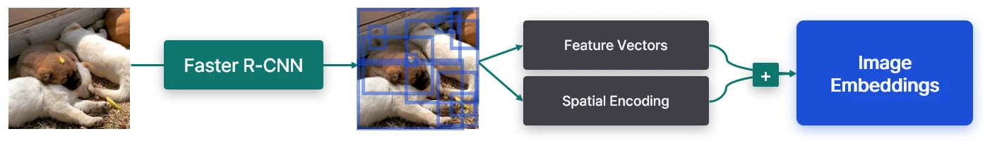 먼저 Faster R-CNN을 이용해 이미지 내의 object bounding box를 추출하고 이 정보를 이미지 feature vector와 spatial(positional) encoding 정보로 사용해요. Spatial encoding은 bounding box의 top-left 좌표(2개), bottom-right 좌표(2개), 객체 영역이 전체에서 차지하는 비율(1개)로 구성된 5D 벡터를 가지게 돼요. Faster R-CNN의 내부에서 추출된 feature vector와 spatial encoding을 합쳐 최종적으로 image embedding을 출력해요. 참고로 이미지의 시작은 <IMG> 토큰을 사용해요.