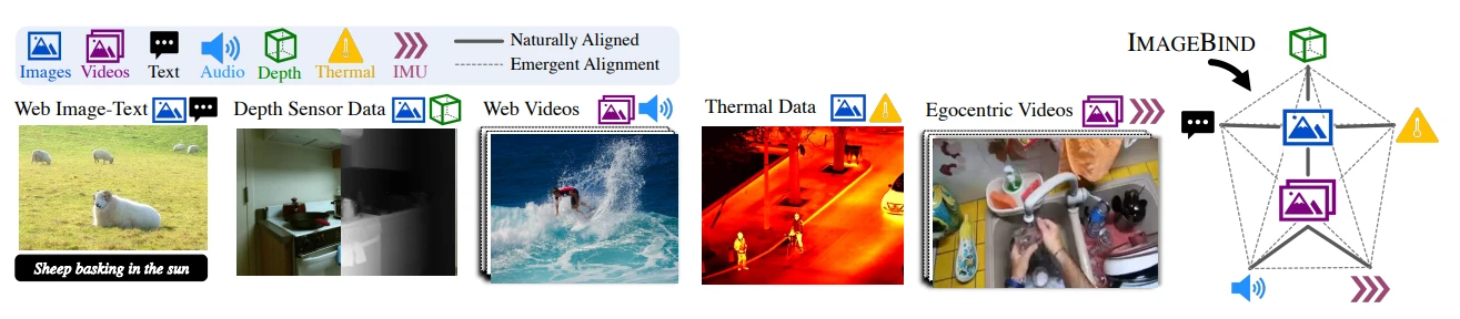 Imagebind는 contrastive loss를 이용해 이미지와 텍스트, 오디오, depth(깊이), thermal(온도) 등을 align해요.