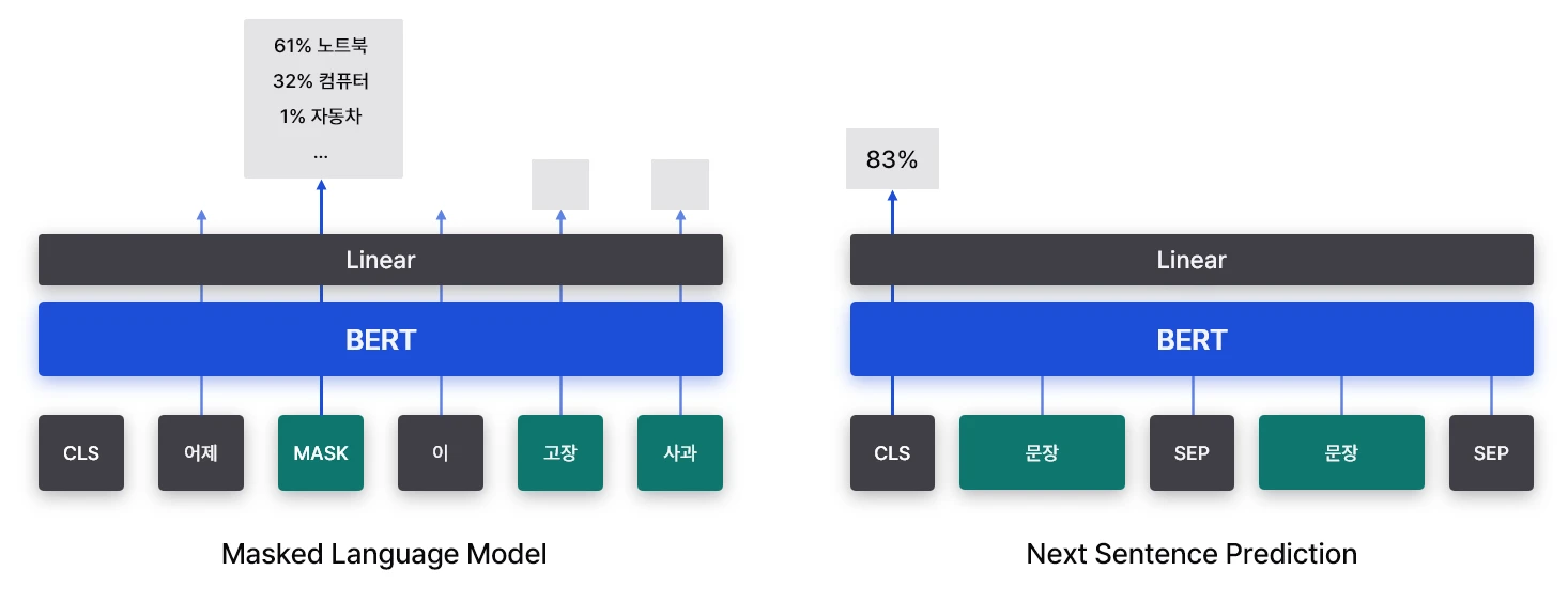 BERT와 마찬가지로 단어를 토큰 단위로 임베딩하며, <SEP>, <MASK>, <CLS>와 같은 특수 토큰을 사용해요. Attention block 전에 positional encoding을 통해 위치 정보를 주입해요. 단순히 단어 토큰 간 관계를 파악하는 것이 목적이지만, 이 경우 명확한 ground-truth 레이블을 매기기 힘들어요. 그래서 BERT에서 했던 것과 마찬가지로 2개의 과제를 만들어 학습에 사용해요.