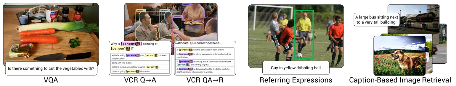 ViLBERT는 두 모달리티의 관계를 학습하고, 이미지와 텍스트를 모두 이해하는 가중치를 학습하는 것이 목표예요. 이렇게 학습된 베이스 모델은 여러 downstream task를 풀기 위해 fine-tune할 수 있어요.