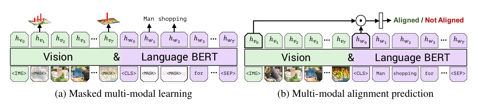 Multimodal learning도 마찬가지로 masked learning과 alignment prediction 문제를 풀며 학습해요.