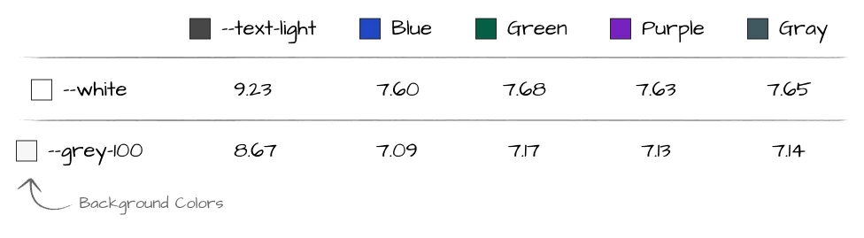 색은 최소한으로 절제하고 싶었어요. 브랜드 컬러는 자주 등장하면 그 임팩트를 잃는다고 생각해요. 그리고 가독성을 살리려면 회색 계열의 계층이 정확히 잡혀 있어야 한다고 생각해요. 이를 위해 모든 색상을 CSS 토큰으로 정의하고, 일관되게 적용될 수 있도록 했어요. 색상 팔레트는 tailwindcss를 참고했어요. 또 색의 대비도 중요해요. 배경색과 텍스트의 대비가 약하면 가독성이 떨어져요. 그래서 브랜드 컬러를 선택할 때 접근성 기준 WCGA Level AA를 만족하는 색상들로만 구성했어요. 물론 텍스트 색상도 대비 값을 고려해서 선택했어요.