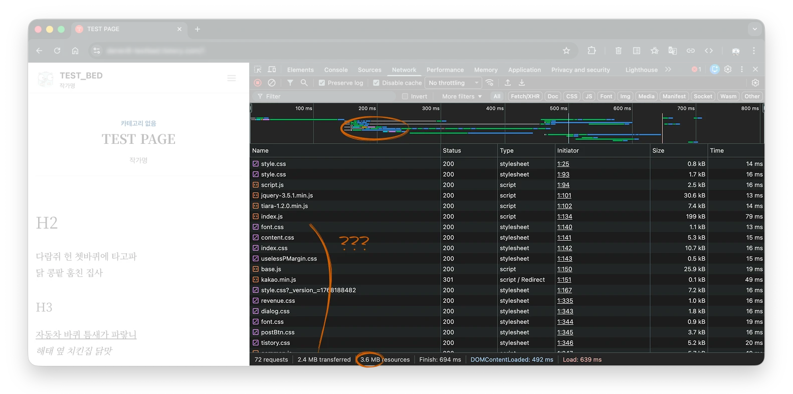 당시 저는 군복무 중이었고, 스킨을 만들기 위해 10일 휴가를 계획했어요. 만약 스킨을 바닥부터 만든다면 10일로 부족해요. 그래서 잘 만든 스킨을 수정하는 방향으로 계획을 잡았어요. ‘한눈에’ 스킨이 최적화가 잘 되어 있었어요. 티스토리의 가장 큰 문제는 불필요한 에셋을 받아온다는 거예요. 이 때문에 처음 접속했을 때 지연이 생겨요.