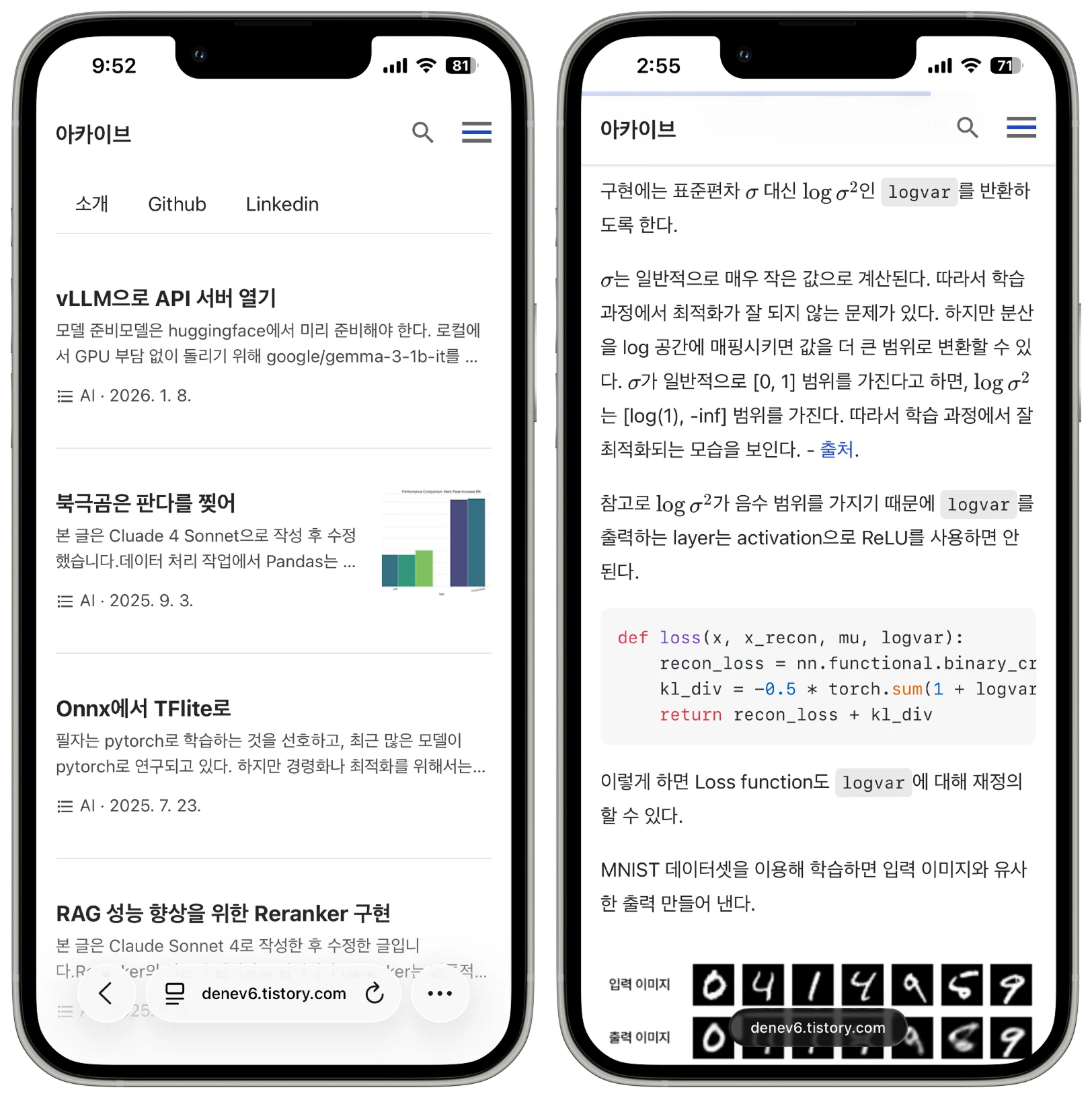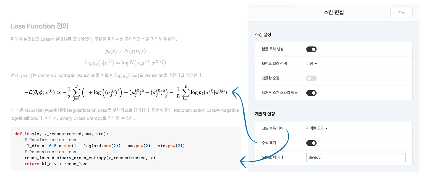 마지막으로 수식 포맷팅과 코드 하이라이팅을 기본으로 지원해요. 수식은 latex 문법으로 작성하면 Mathjax를 이용해 렌더링 되는 방식이에요. 하지만 코드와 달리 수식은 필요하지 않은 개발자도 많을 거라고 생각해요. 그래서 수식 변환을 원하지 않는다면, 스킨 설정에서 비활성화할 수 있도록 했어요. 이렇게 하면 불필요한 리소스를 불러오지 않아도 되죠. 코드 하이라이팅은 highlight.js를 이용해 구현했고, 스킨에서 라이트 모드와 다크 모드를 선택할 수 있도록 했어요.