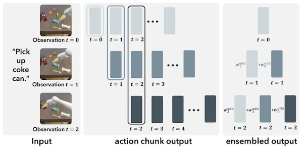 \[\hat{a}_t = \sum_{k=0}^{K} w_k^{\text{ada}} \cdot a_t | o_{t-k}\] \[w_k^{\text{ada}} = \exp(\alpha \cdot < a_t | o_t, a_t | o_{t-k} >)\]$a_t | o_{t}$는 관찰된 상태 $o_{t}$에 대해 예측한 행동 $a_t$를 의미해요. $< \cdot , \cdot >$은 두 값 사이의 유사도를 뜻해요. 즉, 현재 $a_t$는 과거 $a_{1, … t-1}$의 영향을 받으며, 과거 행동 중 유사도가 낮은 행동의 가중치를 지수적으로 감소시켜 과거 시퀀스의 정보가 현재 $o_t$에 자연스럽게 반영되도록 해요.