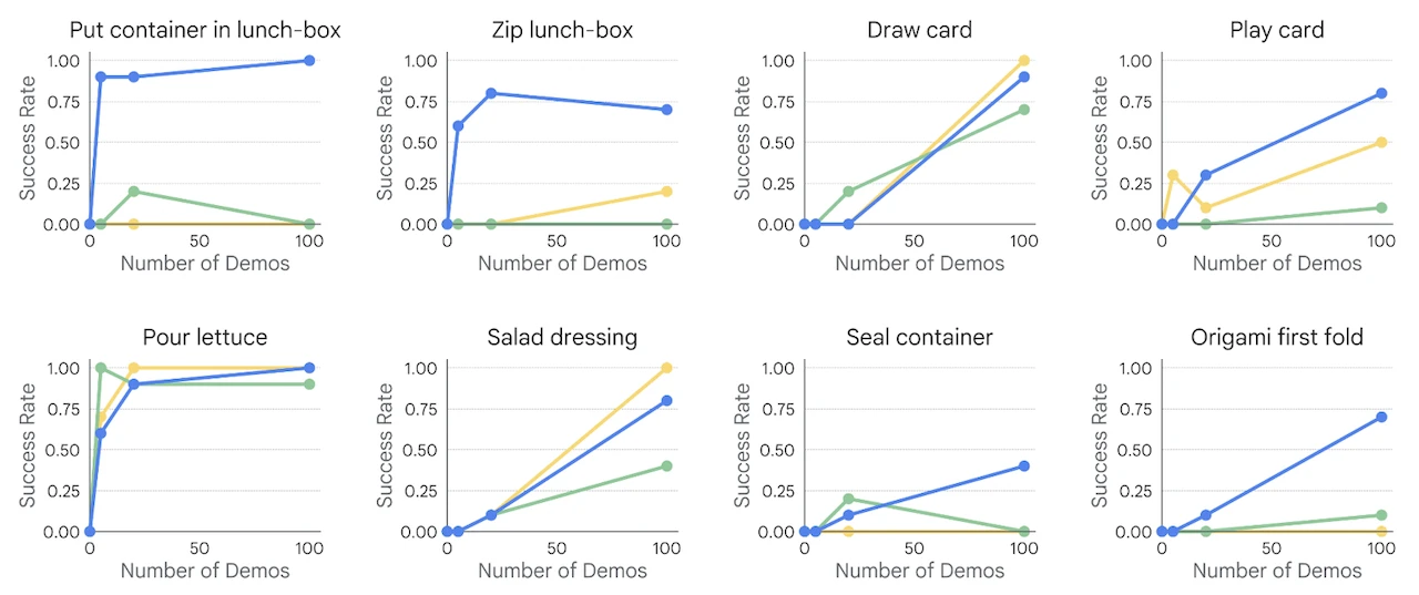 Google은 gemini를 이용해 gemini-robotics를 설계했어요. gemini의 풍부한 지식 덕분에 zero-shot만으로도 뛰어난 embodied reasoning 성능을 보였어요. Embodied reasoning이란 2D/3D object detection, 2D pointing, multi-view correspondence 등 과제를 수행하는 능력을 말해요. 여기에 CoT나 few-shot을 적용하면 성능이 향상되었어요. CoT는 단순히 “Reason step by step about the answer, and show your work, for each step. Only after that, proceed to the final answer”를 지시문 끝에 붙이는 걸 말해요. Few-shot은 시연 예시를 inference time의 프롬프트에 추가하는 in-context example을 말하며, 동작뿐만 아니라 동작에 대한 reasoning을 자연어로 서술해 함께 포함시켜요. 두 방식 모두 성능 향상을 보였으며, 특히 few-shot은 zero-shot일 때 성공하지 못한 과제를 성공하기도 했어요. 더 나아가 inference latency를 줄이기 위해 모델을 두 모듈로 분리했어요. Gemini를 기반으로 한 VLA backbone은 cloud에서 작동시켜 지연 시간을 160ms 미만으로 줄였으며, Action decoder는 로봇에 위치해요. 이 구조를 통해 end-to-end 작업에 약 250ms의 지연이 발생해 실시간 추론이 가능한 수준의 성능을 달성했어요.