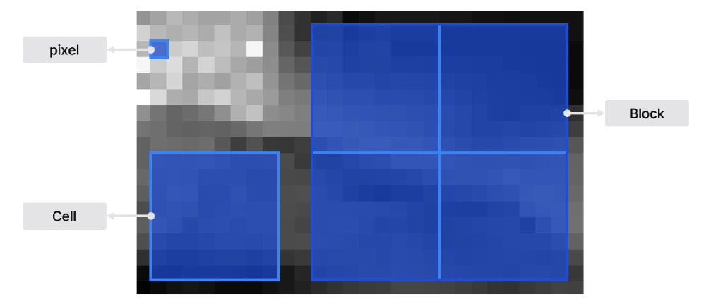참고로 cell은 픽셀을 n x n으로 묶은 단위이며, block은 cell을 m x m으로 묶은 단위예요. 위 예시는 8 x 8 픽셀의 cell과 2 x 2 cell을 묶은 block이에요.