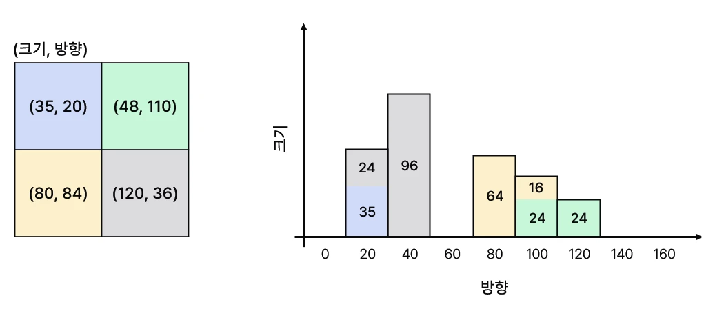 따라서 100과 120에 각각 24를 나누어주는 방식으로 히스토그램을 완성해요. 다른 셀도 같은 방식으로 gradient 크기를 축적해요.