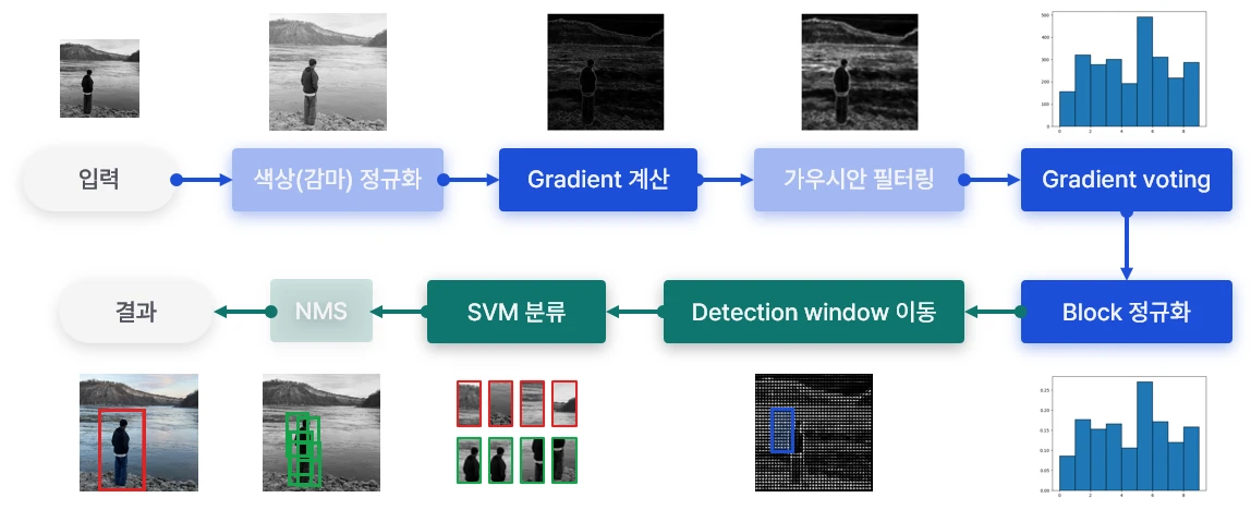 기본 HOG descriptor를 코드로 정리했어요. 각 단계의 결과를 시각화하면 다음과 같아요.