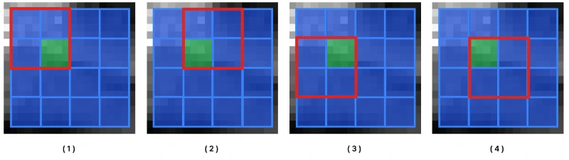 빨간 테두리는 현재 단계에서 정규화가 진행되고 있는 block 크기의 구역을 나타내고 있어요. 초록 색으로 표현한 cell은 총 4번의 정규화에 영향을 줘요. 다른 cell도 중복으로 총 4번의 정규화에 사용돼요.