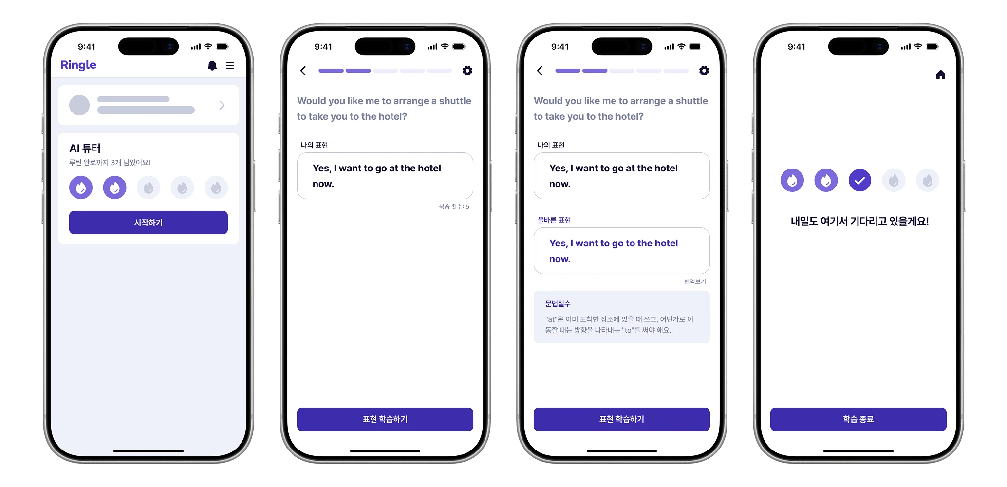 두 번째 요소는 커리큘럼의 시각화예요. 달성해야 할 단기 목표를 설정하고 명확하게 시각화해요. 여기에 링글의 CAFP 분석을 결합했어요. 단순히 루틴을 만들고 시각화하는 것만으로는 경쟁우위를 갖기 어려워요. 따라서 링글의 분석 기술을 활용해 루틴 달성 시 사용자 맞춤 복습을 제공해요. 링글은 이미 ‘AI 분석’이라는 이름으로 ‘명사 수 일치 실수’, ‘전치사 실수’, ‘동사 시제 실수’ 등 사용자의 발화 패턴을 카테고리화하는 작업을 진행 중이에요. 링글 측도 “반복되는 실수는 데이터로 확인”한다고 밝혔어요. 루틴 달성 시 맞춤 복습을 제공하는 방식은 사용자에게 성취감을 주면서 링글의 기존 백엔드를 그대로 활용할 수 있는 접근이에요. 다만 링글이 “강제 학습 장치 도입에는 신중한 입장”이라서 ‘틀린 횟수: n’ 같은 직접적 표현 대신 ‘복습 횟수: n’처럼 부드러운 문구로 사용자가 실수를 간접적으로 인지하도록 접근할 필요가 있어 보여요.