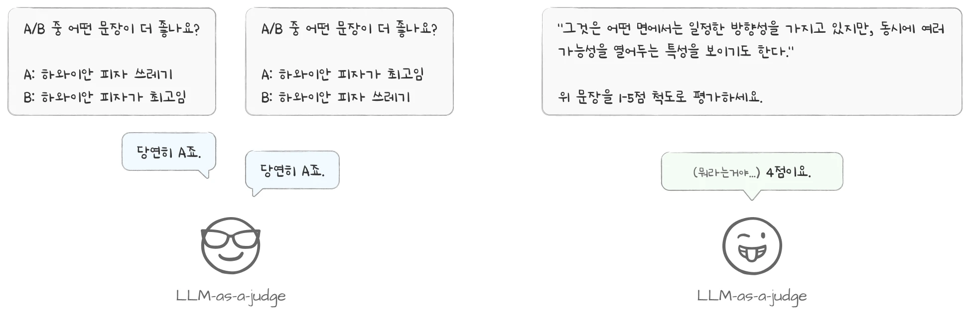 이 문제를 해결하기 위해 자연어처리 분야에서는 BLEU, ROUGE, BERTScore 등 정량적 평가 지표를 정의해 왔어요. 하지만 이런 지표는 실제 인간 선호도와 차이가 있고, 문장이 가진 복합적인 뉘앙스를 포착하는 데 한계가 있어요. 최근에는 LLM을 활용해 문장을 평가하는 LLM-as-a-judge 방법론이 주목받고 있어요.