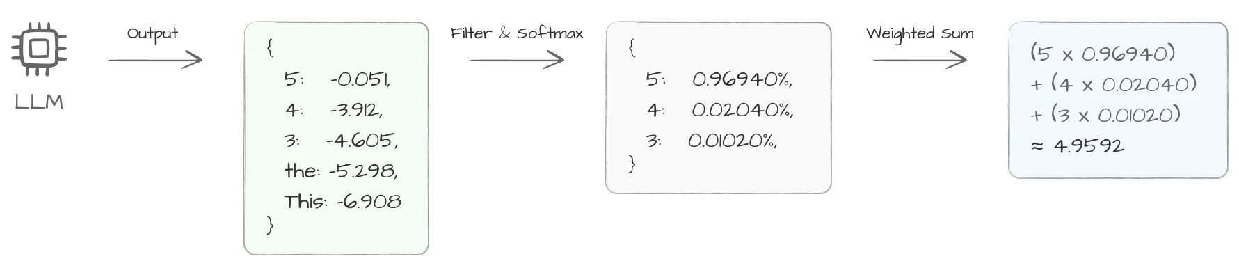 상위 5개 토큰의 확률을 검사해요. 이 중 1-5 사이 숫자가 있다면 해당 숫자의 log 확률을 추출해요. 숫자가 아닌 토큰이 섞여 있을 수 있으므로 합이 1이 되도록 정규화한 뒤 가중합을 계산해요. 그러면 4.96과 같이 정밀한 점수로 평가할 수 있어요. 모델의 출력 확률을 활용해 점수를 재구성하는 방법이에요.