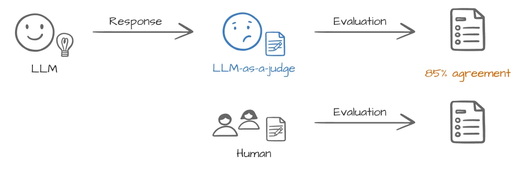 LLM을 활용하면 복잡한 맥락을 이해할 수 있을 뿐만 아니라 많은 양의 데이터를 일관되게 평가할 수 있어요. LLM이 사람과 비슷한 수준의 평가를 할 수 있을지 의문이 들 수 있는데, 결론부터 말하면 가능해요. GPT-4를 이용한 평가는 인간 전문가 평가와 85% 일치한다고 해요. 이는 사람 간 평가 일치도인 81%보다 높은 수준이에요. 즉, LLM이 생각보다 정확하고 일관된 평가를 할 수 있어요. 물론 모든 LLM이 정확한 건 아니에요. 적절한 모델과 방법으로 LLM-as-a-judge를 구축하는 것이 중요해요.