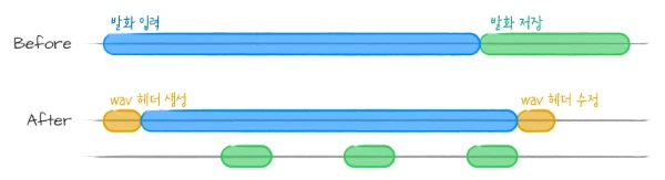 제가 음성 처리 파이프라인 쪽으로 넘어갔을 때, VAD가 구현되어 있었지만 짧은 발화를 인식하는 데 10초가 걸렸어요. 처음에 의심했던 부분은 I/O로 인한 딜레이였어요. 사용자 발화를 메모리에 모두 저장했다가 발화가 종료되면 wav 파일로 저장되기 때문에, 메모리에서 디스크로 저장하는 과정에서 딜레이가 발생할 거라 생각했죠. 그래서 한 번에 wav로 저장하는 대신 실시간으로 디스크에 음성 정보를 밀어넣고, 입력이 끝나면 wav 포맷으로 재구성하는 방식을 이용해 I/O 딜레이를 해결했어요. 그림으로 표현하면 아래와 같아요.