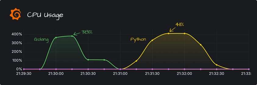 같은 부하를 줬을 때 Go 서버가 CPU를 약 7.3% 적게 사용하는 모습을 확인할 수 있었어요. 이를 통해 Go가 Python보다 빠르고 리소스를 더 효율적으로 사용하는 방향으로 동작한다는 점을 알 수 있어요.