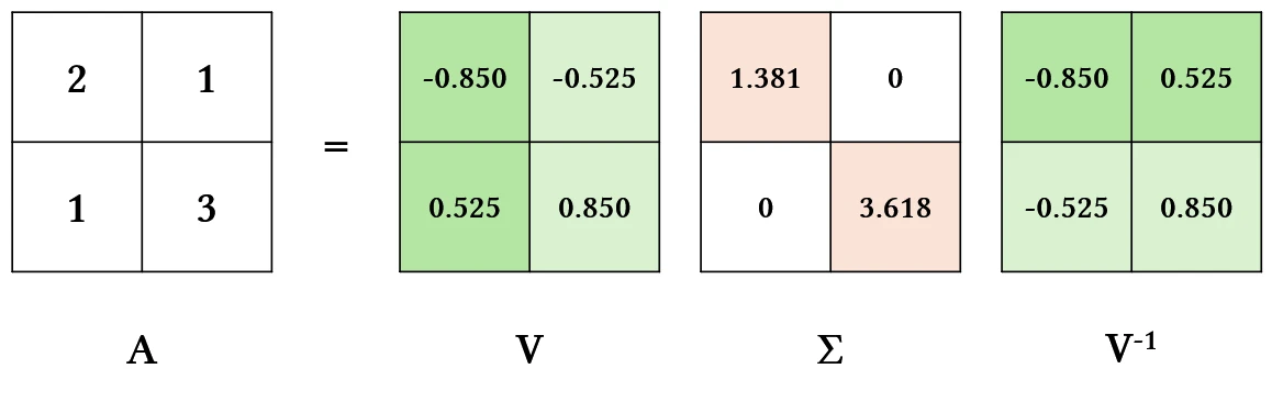 \[A=V\Sigma V^{-1}\]$V$는 각 열이 eigenvector인 행렬이에요. $\Sigma =diag(…eigenvalue)$로 eigenvalue를 담고 있는 diagonal matrix예요.