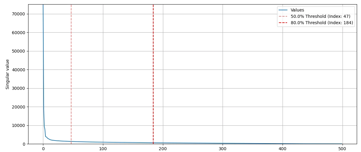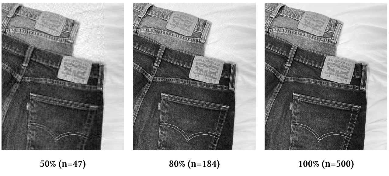 singular value를 시각화해보면 n = 184에서 이미 singular value 총합의 80%를 넘어가요. 184 쌍의 singular vector만으로도 이미지 80%를 복원할 수 있죠.