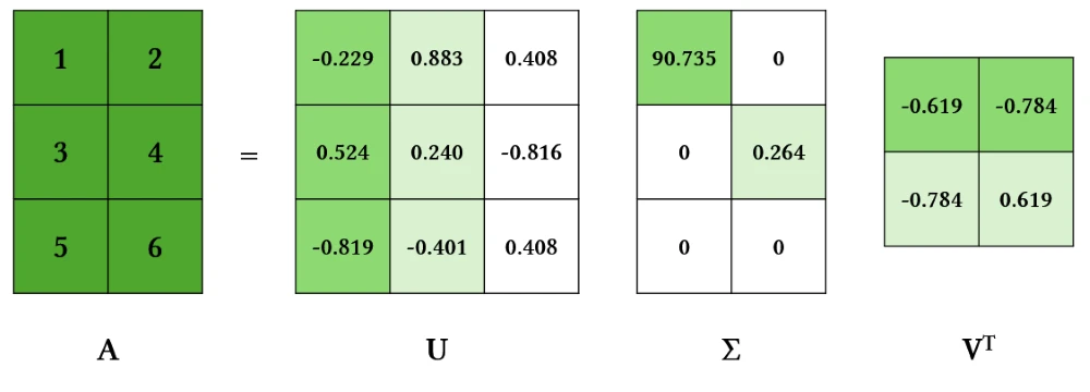 \[A=U\Sigma V^T\]$A$는 m x n 크기의 행렬이며, $\Sigma$는 diagonal matrix예요. 식을 정리하면 다음과 같아요.