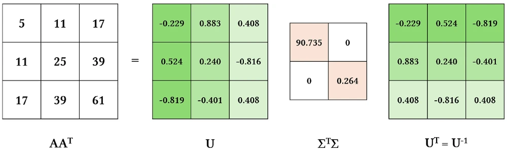 \[AA^T=U\Sigma V^T (V\Sigma^T U^T)\] \[AA^T=U(\Sigma^T\Sigma)U^T\]글 초반에 소개했던 행렬의 특성을 이용해 정리한 식이에요. 위 식을 시각화하면 다음과 같아요.