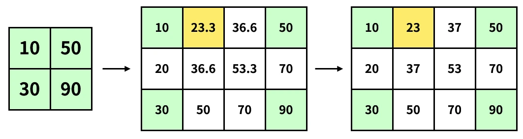 \[P_{2, 1}=\cfrac{P_{1, 1} \cdot 2 + P_{4, 1} \cdot 1}{2 + 1} \approx 23\]거리를 기반으로 가중치를 계산하고 평균을 구해요. 이미지 픽셀은 정수형이기 때문에 근삿값으로 처리해요.