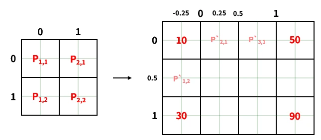 가로 행에 4개의 픽셀이 할당되어야 해요. 따라서 같은 거리로 값을 배치하다 보니 $P_{2,1}’$는 $(0.25, 0)$에 위치하게 돼요. 이 가정을 바탕으로 $P_{2,1}’$을 계산해 보죠.