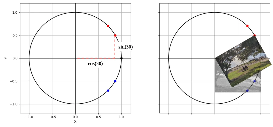 구체적으로 $P(cos30^\circ , sin30^\circ)$를 찍어보면 $P(1,0)$를 반시계 방향으로 회전한 모습이에요. 시계 방향으로 회전한 파란 점은 빨간 점에 대해 x축 대칭이므로 $P(cos30^\circ ,-sin30^\circ)$예요. 구체적인 유도 과정은 gaussian37님의 블로그에 잘 정리되어 있어요.