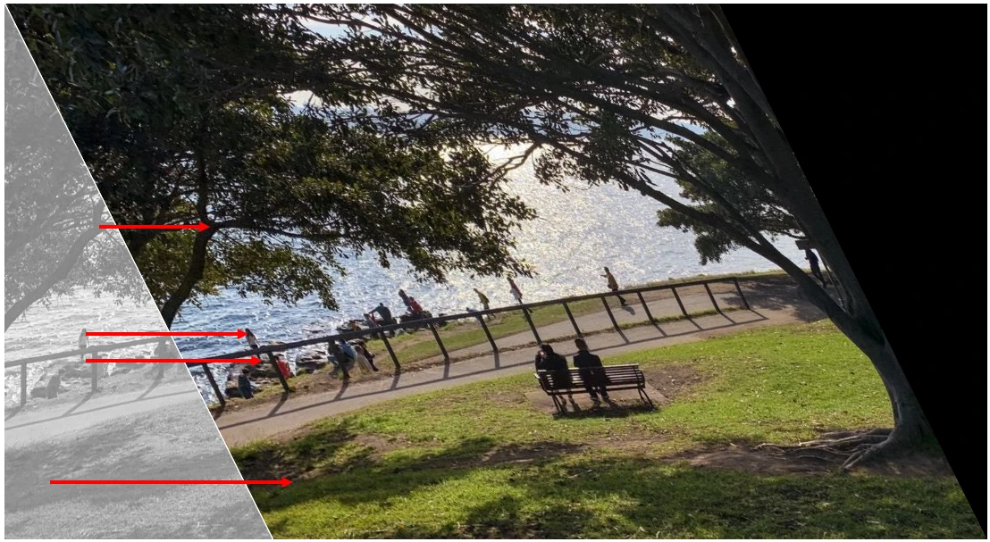 $M_{trans}$는 (3\times3) 변환 행렬이에요. $w$는 이미지를 조정하기 위한 scale factor예요. $M_{q}$는 최종 목표 좌표인 (q)를 담고 있는 행렬이에요. $M_{q}$는 변환 행렬 벡터를 담고 있는 (8\times1) 크기의 (M_{trans}’)와 (8\times8) 행렬 (M_{coef})로 나타내죠. 여기서 LU-decomposition 등 방법으로 (M_{coef})를 분해한 뒤 (M_{trans}’)를 구해야 해요. (M_{trans}’)를 (3\times3) 행렬로 매핑하면 변환 행렬 (M_{trans})를 얻을 수 있어요. 참고로 (M_{trans}) 내 마지막 값은 항상 (1)로 고정되어 있어서 (8\times1) 행렬을 (3\times3)으로 매핑하는 것이 가능하답니다.